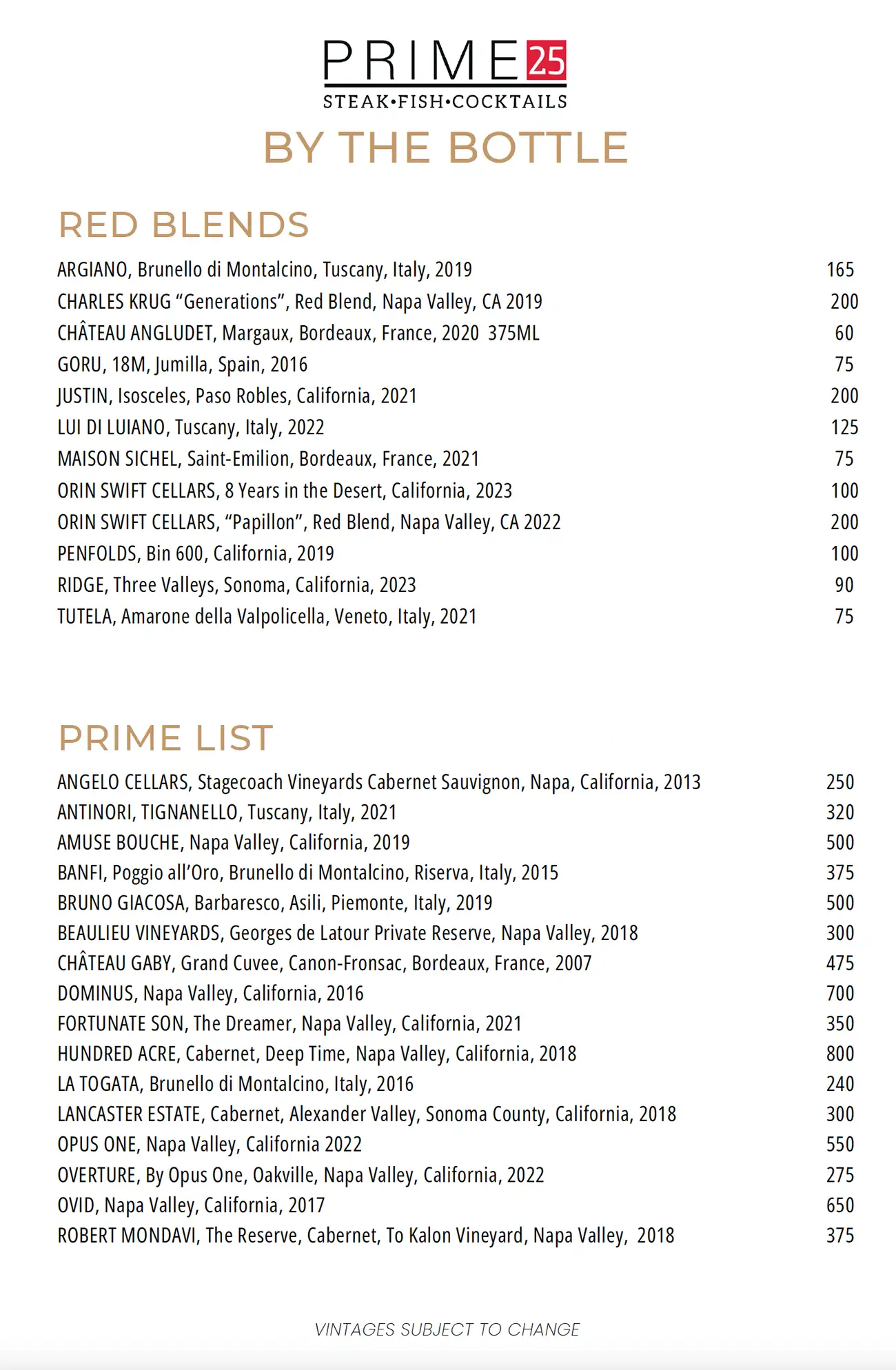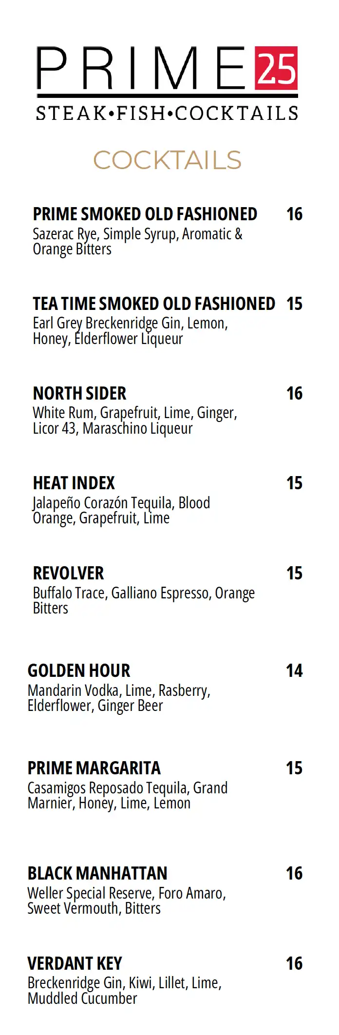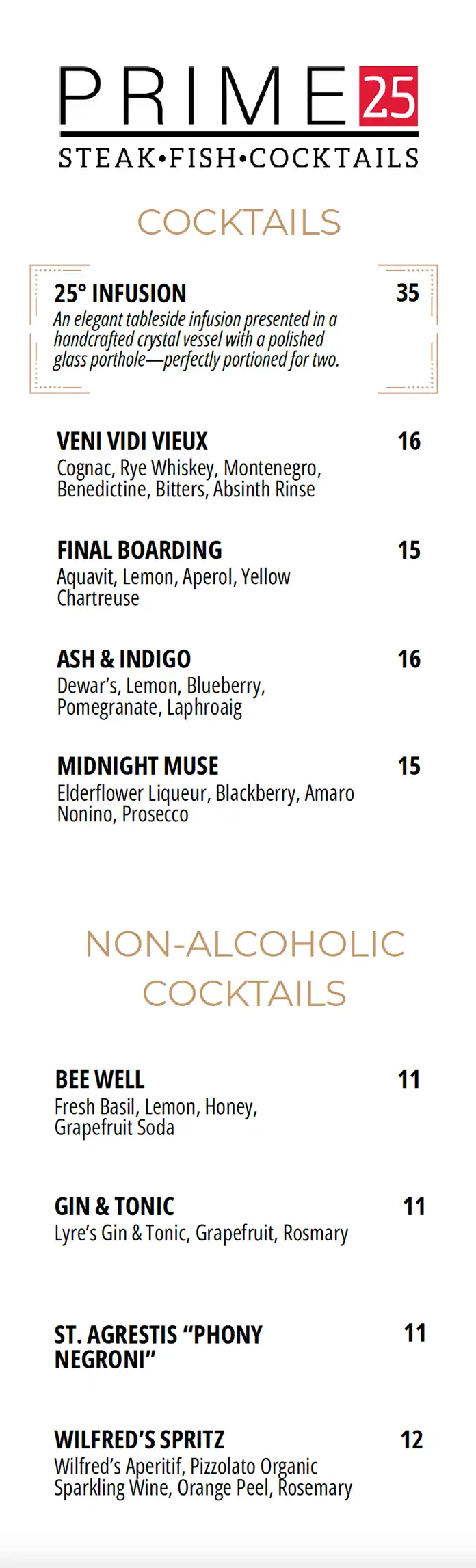 The luxury dining experience at Prime25 North in Colorado Springs extends to our bar, featuring an extensive and meticulously curated drink menu. Whether you seek a classic vintage, a sparkling celebration, or an innovative signature cocktail, our list of wines and mixed drinks is designed to perfectly complement our modern steakhouse fare. To ensure the ultimate pairing, our knowledgeable staff is always available to offer expert recommendations tailored to your chosen meal.